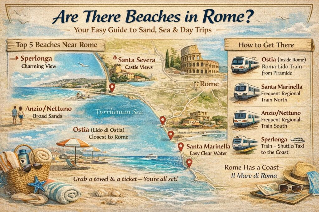 You’re asking “are there beaches in Rome?” because you want to mix Colosseum days with a salty breeze. Good news: while Rome sits inland along the Tiber, the city does have its own seaside district and plenty of easy day-trip beaches. In this guide you’ll learn where to go, how to get there (train, bus, or car), what it costs roughly, and how locals do a beach day.