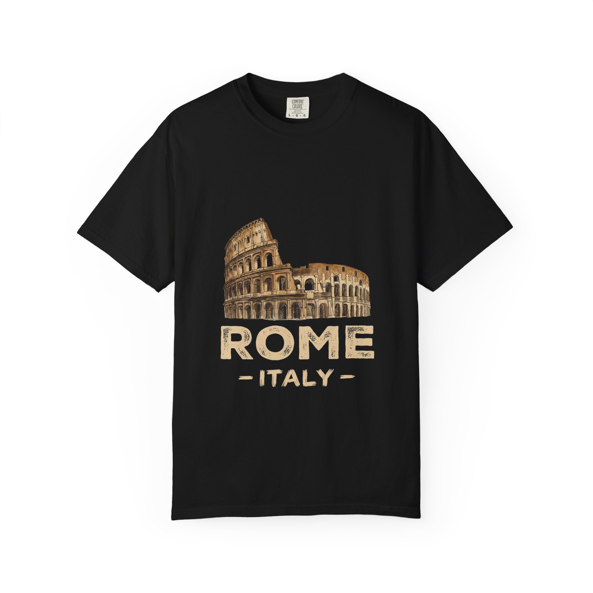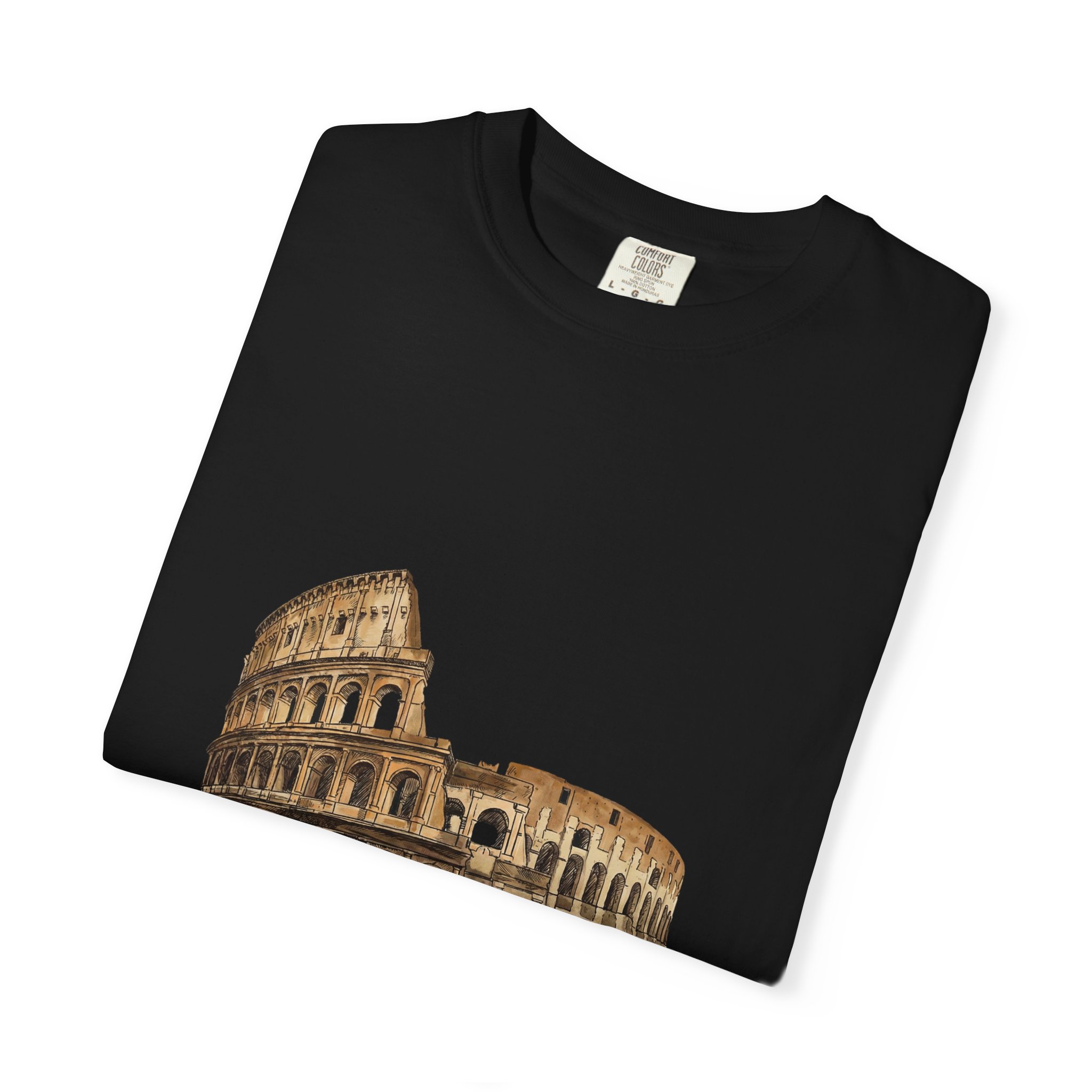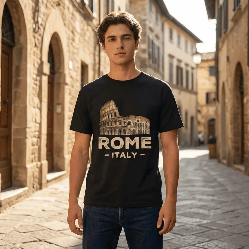 This heavyweight garment-dyed tee carries a quiet love letter to Rome. A painterly Colosseum sits above warm, sun-kissed lettering that reads “ROME — ITALY,” rendered in aged, watercolor tones that feel like a page torn from a travel journal. The relaxed fit and soft, broken-in texture make it comfortable for long wandering days through cobblestone streets or for slow afternoons flipping through maps and espresso memories. It wears like a well-traveled favorite — substantial, lived-in, and full of small details that nod to heritage travel and slow discovery.